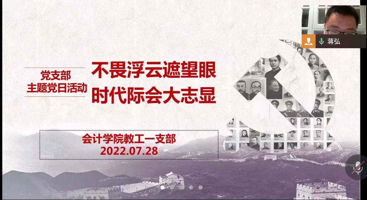 2022年7月28日,会计学院教工一支部通过企业微信召开了题为“不忘浮云遮望眼,时代际会大志显”的主题党日活动。活动由教工一支部书记蒋弘主持,一支部全体党员参加了会议。