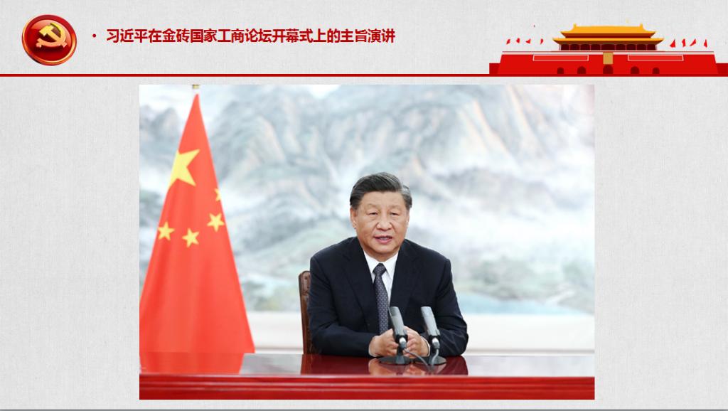 6月22日晚,习近平总书记以视频方式出席金砖国家工商论坛开幕式并发表题为《把握时代潮流 缔造光明未来》的主旨演讲。习总书记提出我们要“团结协作,共同维护世界和平稳定”、“守望相助,共同促进全球可持续发展”、“同舟共济,共同实现合作共赢”、“包容并蓄,共同扩大开放融合”等中国建议。在主题党日活动上,蒋弘以文字、数据和图表等方式,介绍了“金砖国家”的发展情况,详细解读了习总书记的主旨演讲。从习总书记的建议中可以看出,“金砖国家”之间不仅要抱团取暖,还要进一步扩大与外界的交流合作。并且,我国在金砖国家领导人第十四次会晤上明确提出了“金砖国家应推进扩员进程”的建议。对此,蒋弘分析了这一建议的大背景:当前国际力量的对比发生了根本性改变,新旧交替导致新老力量交锋不可避免,这就对新兴力量提出了新的要求,即需要更多伙伴结伴而行。这不仅可以避免新兴力量因一盘散沙而被老旧势力各个击破,也有助于新兴力量在西方旧规则之外建立新的规则。习总书记说得好“泰山不让土壤,故能成其大;河海不择细流,故能就其深”。这说明,金砖国家组织不只是一个让外人瞩目的漂亮标签,更是饯行人类命运共同体理念的优良载体。成员国之间求同存异,兼收并蓄,以友好尊重的姿态携手共进,历史的天平就会偏向包括中国在内的每一个务实的理想主义者。因为和平开放和共同发展是绝大多数人期望的光明未来,这就是人心所向。
