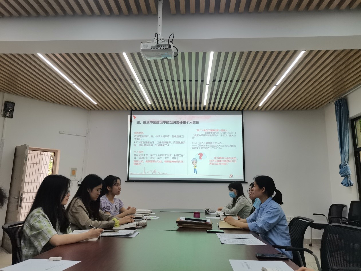 程洁老师首先回顾了党的十八大以来习总书记关于人民健康和健康中国建设的系列重要讲话,并分享了三点基本学习感受,一是体系庞大,内容全面;二是站位高远,又接地气;三是始终坚持“以人民为中心”。其次,引导全体党员思考“健康中国建设”的重要意义,正如2016年习总书记《在全国卫生与健康大会上的讲话》中指出,“健康是促进人的全面发展的必然要求,是经济社会发展的基础条件,是民族昌盛和国家富强的重要标志,也是广大人民群众的共同追求。”然后,程洁老师讲述了自党的十九大作出实施健康中国战略的重大决策部署以来,国务院以及各级人民政府对于“健康中国建设”的执行情况;并特别以重庆为例,展示了重庆2021年实施“健康中国重庆行动”的工作成绩。最后,程洁老师分享了“健康中国建设”中的组织责任和个人责任,并引导大家思考讨论“作为青年大学生党员,如何在健康中国建设中发挥自己的作用?” 支部党员踊跃发言,理论联系实际,由点到面,表达了个人的思考。唐霄寒认为可以推荐阅读有关健康的书籍,学习健康知识,提升健康认知;吕泽僖认为可以带动同学们一起运动,改变熬夜、网瘾等不良习惯,增强健康管理的主动性;张旭同志以亲人为例,意识到疾病都是从量变到质变的,老一辈对健康的忽视不可取;张雨涵认为要从日常做起,健康饮食,减少外卖、不吃早餐、暴饮暴食等不良习惯;陈瑜昕认为要关注心理健康,建议党支部可以组织心理活动,树立心理健康意识,增强维护心理健康的能力。总之,在“推进健康中国建设”中,青年学生党员在健康认知、健康管理主动性、健康道德意识和法律意识等方面都可以发挥榜样作用。