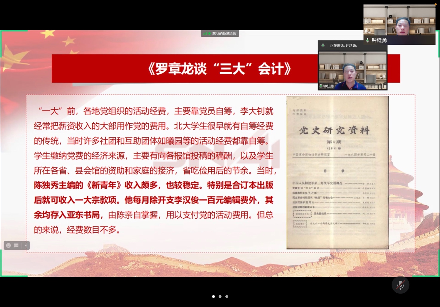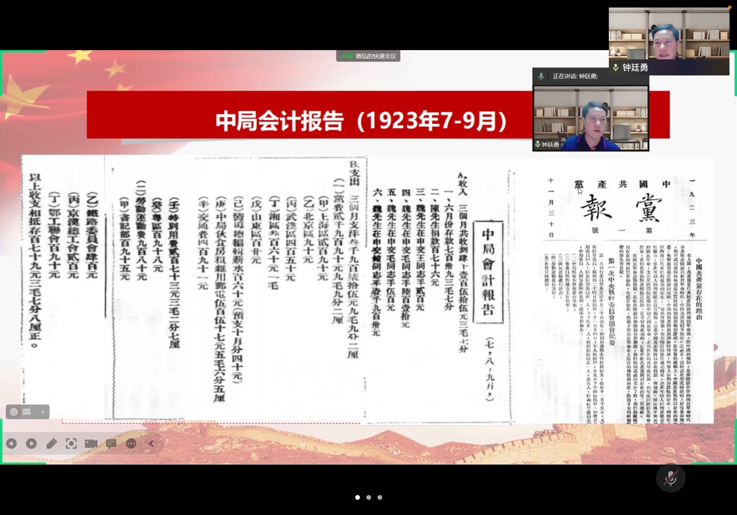 主题党日活动分为三个环节。在第一个环节,钟廷勇同志给大家带来了一节精彩的党课《会计与中共早期革命》。根据他的讲述,在新中国成立前,为了打破敌人对革命根据地的封锁,促进根据地政权稳固和经济发展,中国共产党在中央苏区和陕甘宁边区等根据地对会计工作进行了卓有成效的探索和尝试,对于统一根据地财政、保障前方供给、粉碎敌人的封锁,发挥了巨大的作用,为新中国的会计事业奠定了坚实的基础。历史是最好的教科书,钟廷勇同志的分享深化了支部党员对历史和时代之变的认识,便于支部党员找准党和人民的所想所需,从而选择合适的方法路径,置身新时代的历史方位,明确奋斗的责任使命,立足岗位做好工作,在实干中成就一番事业,开启新时代建设新篇章。