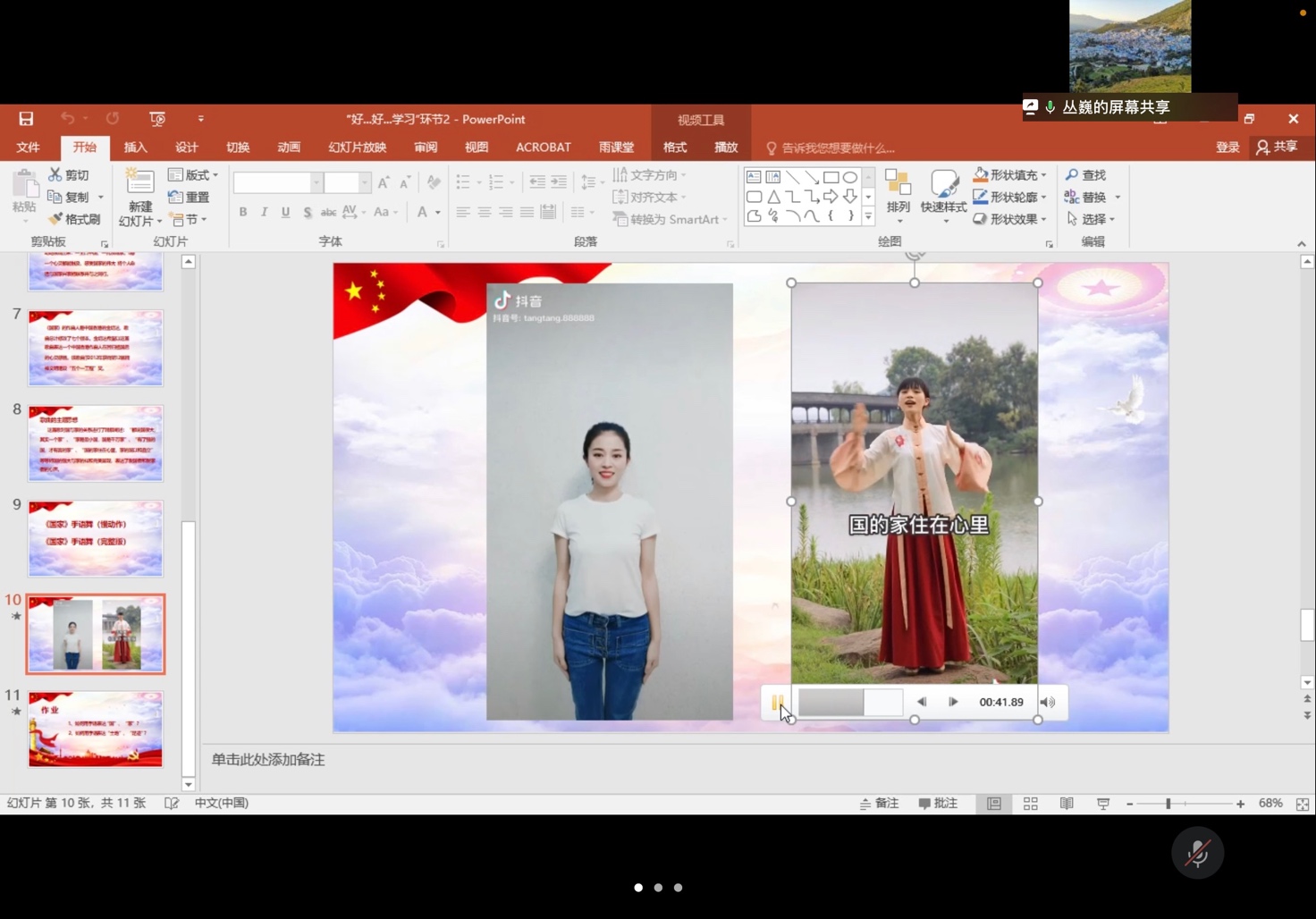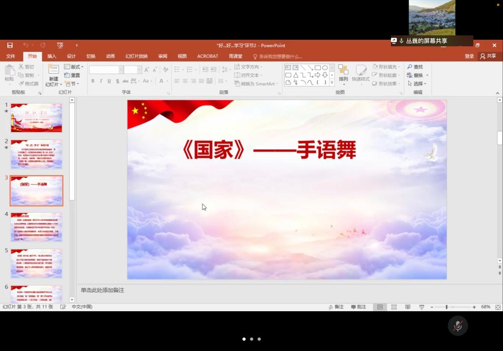 在第三环节的“好…好…学习”专栏,丛巍同志分享了《国家》手势舞。《国家》是一首振奋人心的爱国歌曲,由成龙、刘媛媛演唱。这首歌以其恢弘的音乐、平实的歌词道出了中国人对国与家的深厚情感,展现了国的强大与家的祥和的重要性。《国家》手势舞是在歌唱中配合手语动作的艺术表现形式,具备听觉和视觉的双重冲击力,更能体现出家国情怀。