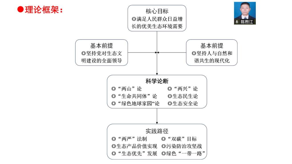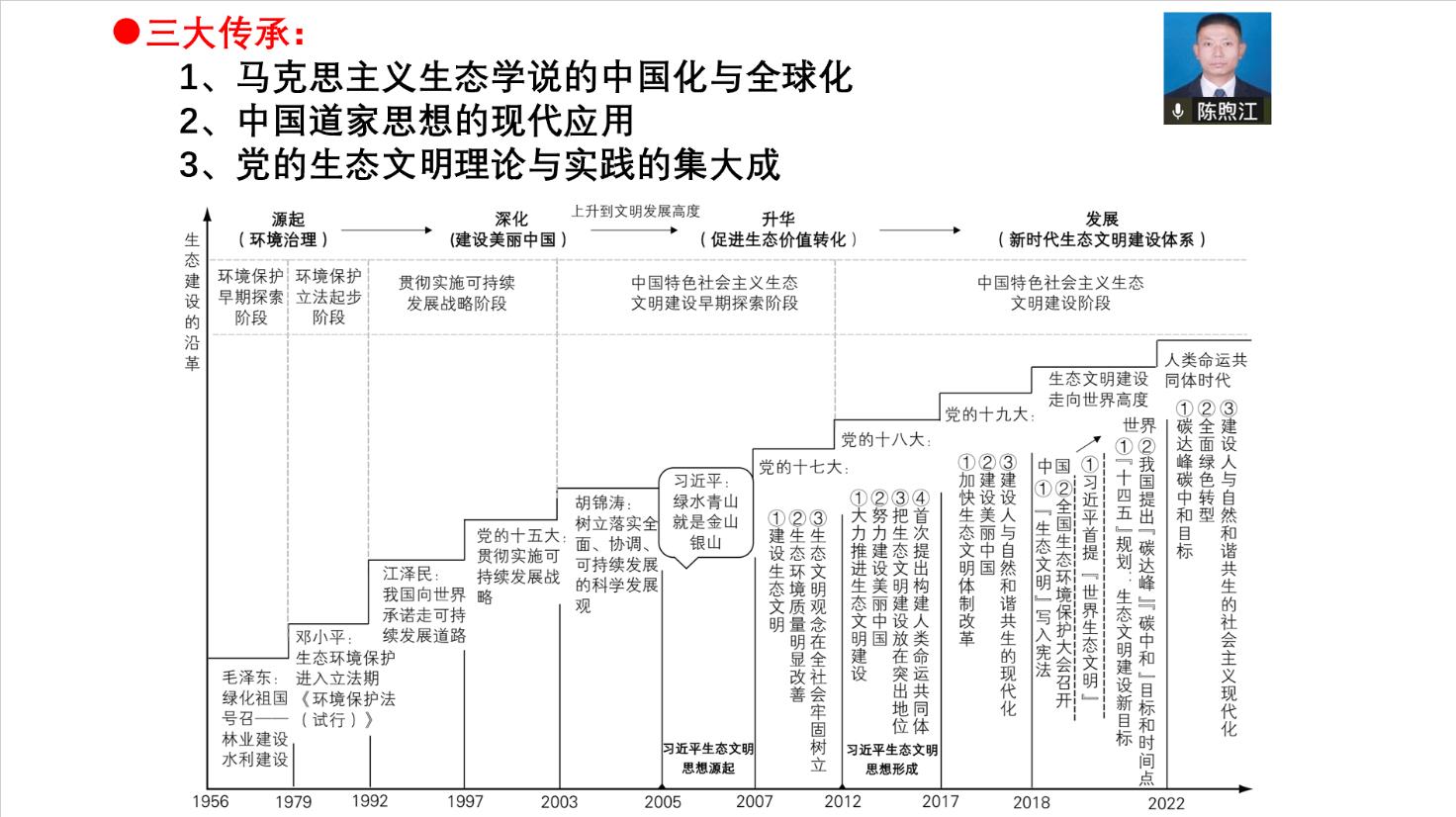 在活动的第二个环节,由陈煦江领学“习近平在首个全国生态日到来之际作出的重要指示精神”。陈煦江对习近平生态文明思想的形成历史、三大传承、三大超越与理论框架进行了学理性解读。习总书记是生态环境保护工作的积极倡导者和践行者,他在不同地方工作期间都高度重视生态环境工作。习总书记的生态文明思想形成历史可以追溯到他作为知青的岁月和从事地方政府工作的经历。他的思想传承了马克思主义生态学说的中国化与全球化,运用了中国道家思想,并将党的生态文明理论与实践进行了综合提升。习总书记的思想超越了西方的“深绿”思潮、“浅绿”思潮和“红绿”思潮,形成了独特的生态文明理论框架。