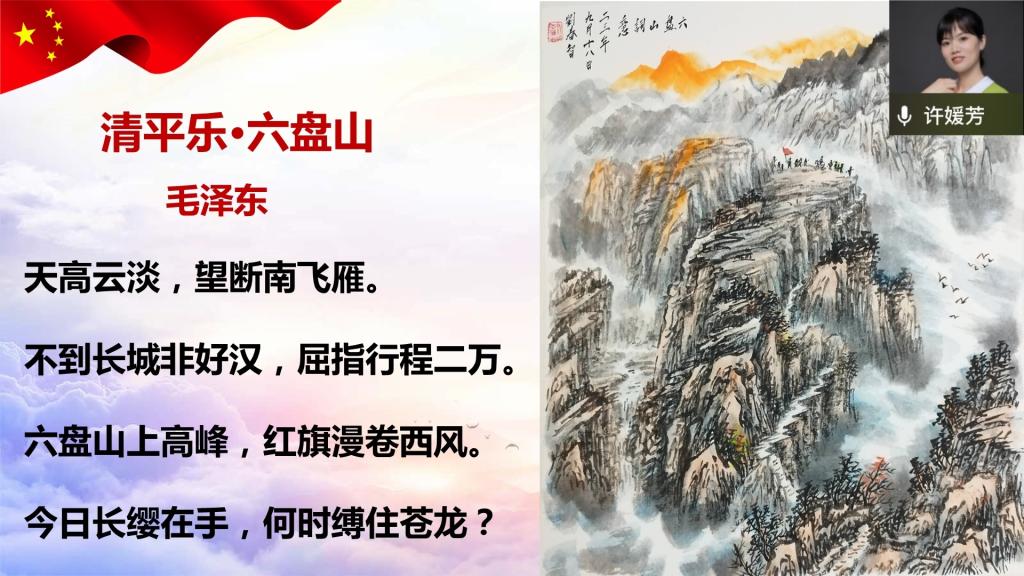 在活动的第三个环节,许媛芳在“好…好…学习”专栏给大家分享了毛主席在1935年带领部队翻越六盘山时创作的咏怀之作《清平乐·六盘山》。这首词表达了红军战士们勇往直前的钢铁意志和抗战必胜的坚定信念。毛主席是中国人民的伟大领袖,同时也是一位杰出的诗人。他的诗词博大精深,意蕴深刻,展现了中国革命史的宏伟画卷,深受人民喜爱,并在全世界产生了影响。