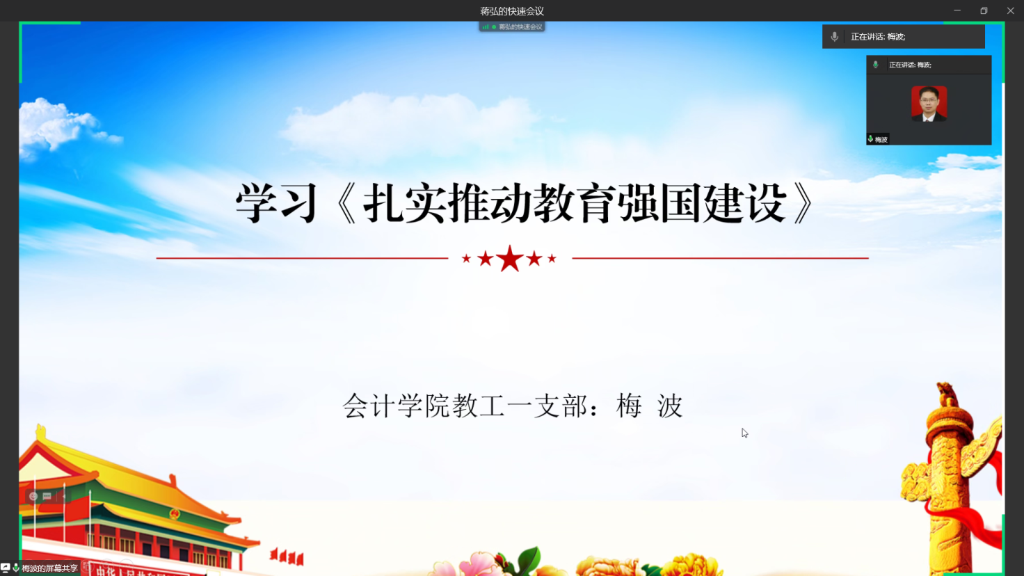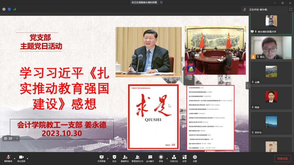 在活动的第一个环节,由支部纪检委员梅波同志领学习近平总书记在2023年9月16日出版的第18期《求是》杂志上发表的重要文章——《扎实推动教育强国建设》。在这篇文章中,习总书记总结了我国教育事业取得的巨大成就,也指出我国从教育大国向教育强国跨越的征途中仍面临不少差距、短板和弱项。总书记对如何加快建设中国特色社会主义教育强国这一问题提出了六个着力点,并明确了建设教育强国是全党全社会的共同任务。梅波同志结合领学内容,又给大家介绍了相关文章《高等教育强国建设的成就与路径——从内涵式发展到高质量发展的演进》。