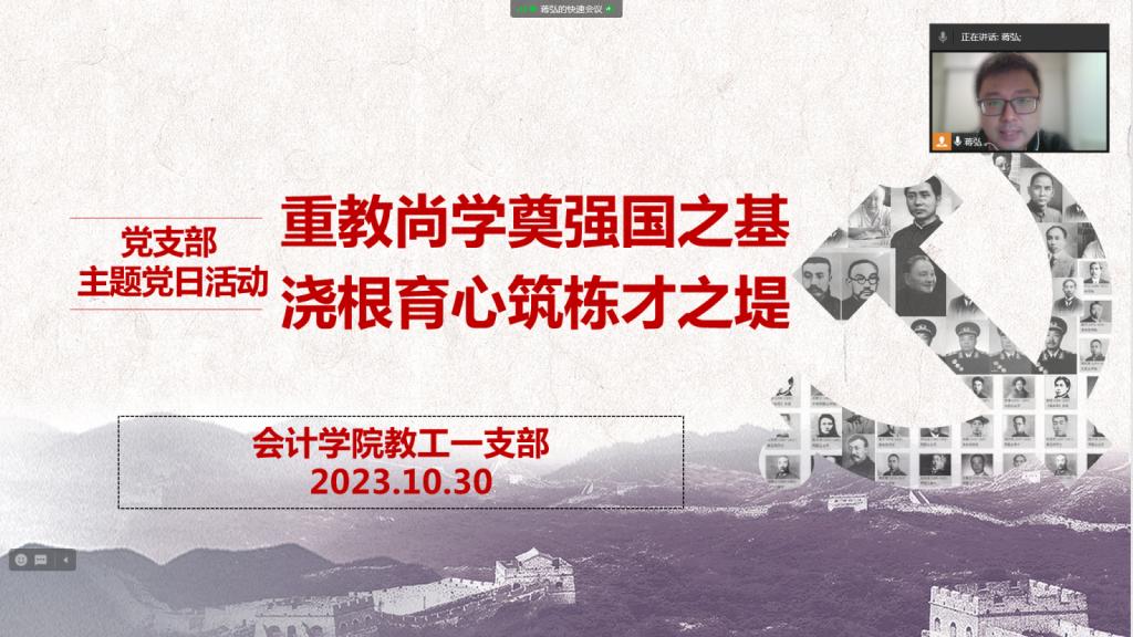 一个民族重视教育、崇尚学习,就能够奠定国家富强、民族昌盛的基础。习近平总书记十分关心我国的教育事业。他提醒我们,浇花要浇根,育人要育心。我们教育的目的是要培养出可以继承中国特色社会主义事业的德才兼备的栋梁之才。这些人才凝聚在一起就会形成一股气势磅礴不可小觑的力量,就像一座坚实庞大的堤坝一样,既能为国家创造价值,也能为国家抵御风险。围绕教育这一话题,9428cn太阳集团古天乐教工一支部于2023年10月30日举行了名为“重教尚学奠强国之基,浇根育心筑栋才之堤”的主题党日活动。活动由支部书记蒋弘主持。