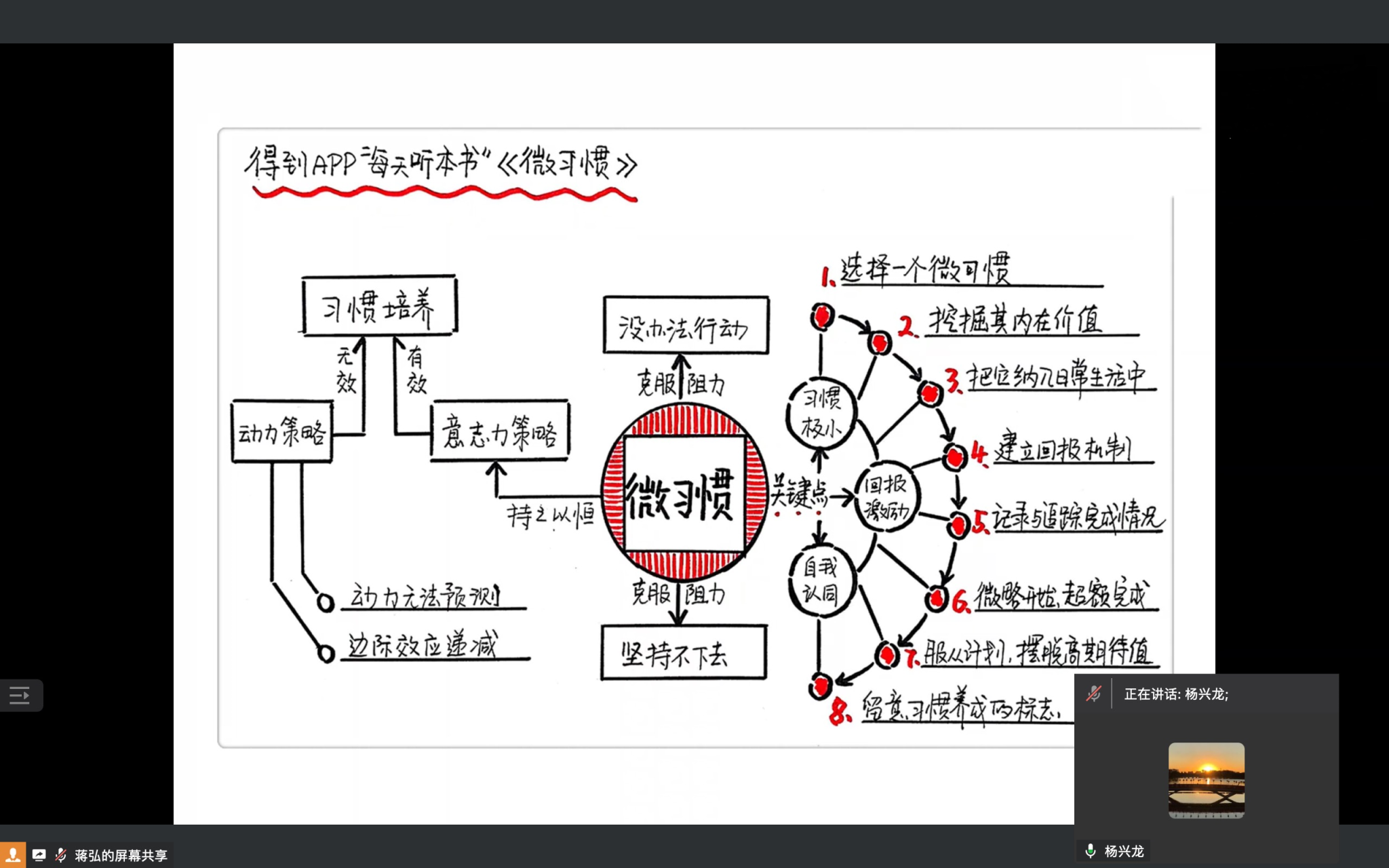 在主题党日活动的“好…好…学习”专栏,杨兴龙同志介绍了美国人斯蒂芬·盖斯分享自我管理经验的一本书——《微习惯》。“微习惯”是一种帮助人们养成好习惯的新策略,它强调把大的目标分解成每天都可以轻松完成的小行为。这种方法可以降低目标的难度,增加目标在操作上的可持续性,帮助人们更容易地克服拖延症,实现自己的长期目标。