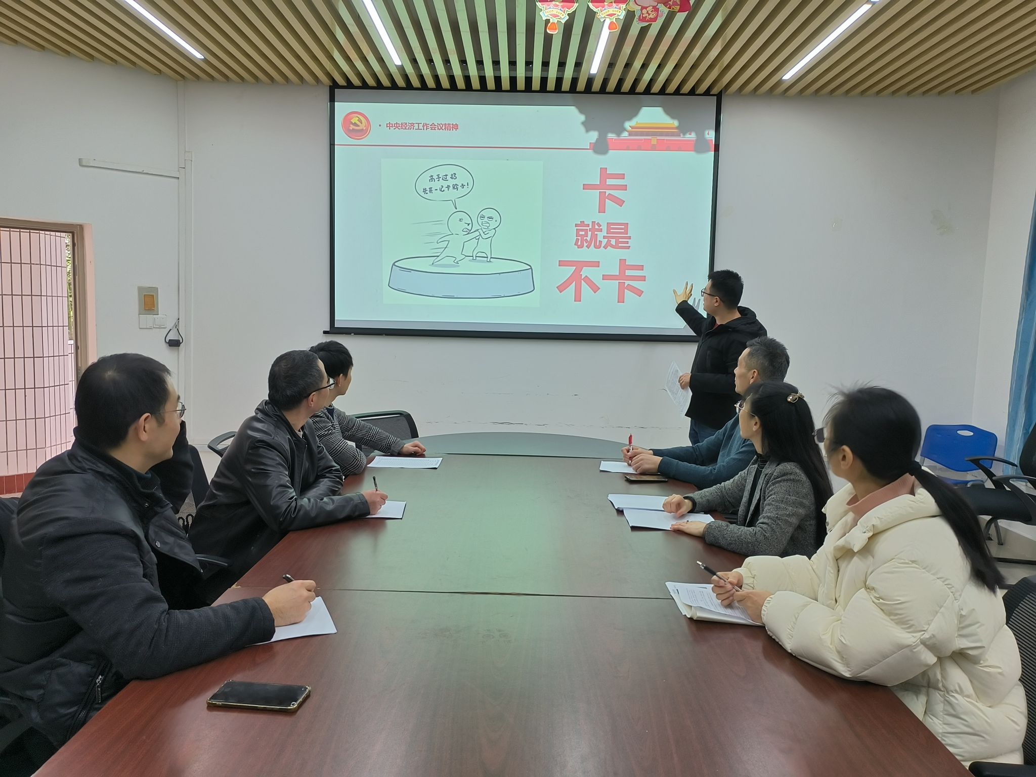 中央经济工作会议于2023年12月11日至12日在北京举行。习近平总书记出席会议并发表了重要讲话。习近平总书记在讲话中全面总结了2023年经济工作,深刻分析了当前经济形势,系统部署了2024年的经济工作。此次会议对2024年的经济工作提出了九项要求,其中把科技创新引领现代化产业体系建设放在了第一位。教工一支部书记蒋弘首先带领大家学习了此次中央经济工作会议的精神,然后结合其中关于科技创新的内容,讲了一堂微党课《卡就是不卡》。在2018年美国对我国发起贸易战之后,《科技日报》发表了系列文章,罗列了35项“卡脖子”技术。经过五年时间,我国已经在29项技术上实现了突破,完全不怕“卡脖子”了,其中还有5项技术处于世界领先地位,剩余6项“卡脖子”技术中有5项虽然还不能完全独立自主,但是曙光已近在眼前。别人卡我们脖子,逼着我们加大力度、集中资源搞自主研发,然后我们的技术和产品就逐渐成熟,甚至还超越了对方,这就是所谓的“卡就是不卡”。蒋弘通过该微党课旨在告诉大家,在全球风云变幻的时代,黑天鹅、灰犀牛事件层出不穷,这时对我们而言最重要的是要坚定信心,要相信党中央的英明领导。中央经济工作会议为我国经济的高质量发展指明了方向,展现了我国在新的一年里实现经济增长的信心和决心。所谓“沉舟侧畔千帆过,病树前头万木春”。若干年后,我们的腰板将比现在更挺直,步伐将比现在更坚定,国家认同感和民族自豪感将比现在更强烈。回往我们走过的荆棘之路,我们会为中华民族的勤劳、勇敢、智慧、坚韧、团结、奉献而感到无比骄傲。