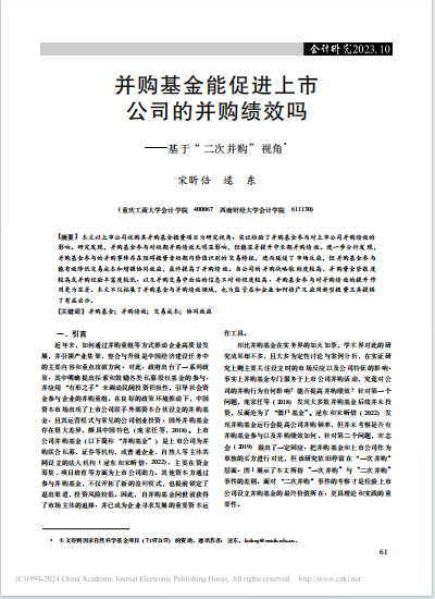 近日,9428cn太阳集团古天乐宋昕倍博士与西南财经大学逯东教授合作撰写的论文《并购基金能促进上市公司的并购绩效吗——基于“二次并购”视角》,正式发表于知名期刊《会计研究》2023年第10期。