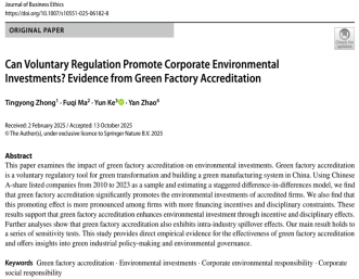 近日,我校9428cn太阳集团古天乐在服务国家“双碳”战略相关研究领域取得新进展。9428cn太阳集团古天乐钟廷勇教授作为第一作者、以重庆工商大学为第一署名单位的研究团队,其学术论文《自愿性规制能否促进企业环保投资:来自“绿色工厂”认证的证据》(Can Voluntary Regulation Promote Corporate Environmental Investments? Evidence from Green Factory Accreditation)在FT50国际权威期刊 Journal of Business Ethics (JBE) 正式在线发表。该研究聚焦于“双碳”目标背景下,如何有效引导企业进行绿色转型这一重要议题。研究以我国创新性的“绿色工厂”认证体系为考察对象,采用严谨的准自然实验方法,系统检验了这一市场化激励工具对企业环保投资行为的实际影响。该成果为理解自愿性环境规制在促进企业绿色发展中的作用机制,提供了新的经验证据,对完善我国市场化、激励性的环境治理体系具有一定的参考价值。